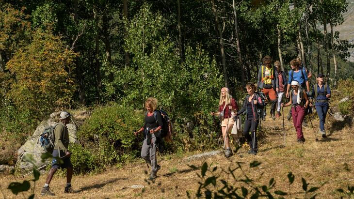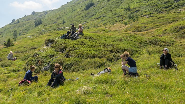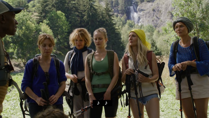 Sara, Patty, Noémie, Valérie, Karen, and Morgan arrive at the train station. The six women feel enthusiastic as they head off to place their friend’s ashes at the top of the Dôme de la Lauze mountain.